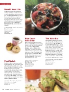 DINING GUIDEBenefit Your LifeLooking for healthy options, but still craving something to satisfy your sweet tooth? Look no further than Bene t Your Life. Try a Dairy Free Scone and choose from your favorite avors: raspberry chocolate, mixed berry, blackberry, blueberry, and blueberry peach to name a few. Visiting on a Saturday morning? Make sure and order a Gluten Free Buttermilk Biscuit, baked fresh each Saturday.620 N. Campbell Rd., Suite 24; 865-288-3193 Mon: 10 a.m.-2 p.m.Tues-Fri: 9 a.m.-6 p.m.Sat: 9 a.m.-3 p.m.Sun: closedbene tyourlife.comFirst WatchBreakfast is the most important meal of the day, and there’s no better way to start o your day with a healthy choice. First Watch’s breakfast menu makes choosing healthy easy with their delectable options like the Avocado Toast— thick- cut whole grain toast topped with smashed avocado, lemon, two basted eggs, and sea salt. Want to kick it up a notch? Try the Tri-Athlete, an egg white omelet with roasted mushrooms, onions, tomatoes, and green chilies.6474 Kingston Pike; 865-249-8795/ 11682 Parkside Drive; 865-675-3447Sun-Sat: 7 a.m.-2:30 p.m. rstwatch.comBlue CoastGrill & BarWith an extensive gluten free menu, Blue Coast Grill & Bar has been serving healthy menu options to Knoxvillians for years, like the Napa Valley Chicken— grilled chicken breast, lemon wine reduction, topped with sundried tomatoes, goat cheese, and your choice of two sides. Eating with friends? Order the Shareable Three for All— Made from scratch roasted red pepper hummus, queso fresco, guacamole and corn chips.37 Market Square; 865-243-2300 Mon-Thurs: 11 a.m.-10 p.m.Fri: 11 a.m.-11 p.m.Sat: 8:30 a.m.-11 p.m.Sun: 8:30 a.m.-10 p.m.bluecoastgrill.comThe Juice BarWith a menu featuring every type of smoothie possible, healthy has never tasted so good at The Juice Bar. Try the Smooth Beet Smoothie — juiced carrot, apple, and beet with pineapple, mango, ginger, and lemon. In the mood for a fan favorite? Order an Acai Bowl with acai puree, banana, and organic almond milk topped up with granola, almond butter, strawberries, blueberries, banana, chai and hemp seeds, coconut akes, and goji berries, as well as bee pollen and local honey.4801 Kingston Pike / 11681 Parkside Drive Mon-Fri: 7 a.m.-7 p.m.Sat: 8:30 a.m.- 5:30 p.m.Sun: 11 a.m.- 5 p.m.ilovejuicebar.com62JANUARY FEBRUARY 2017